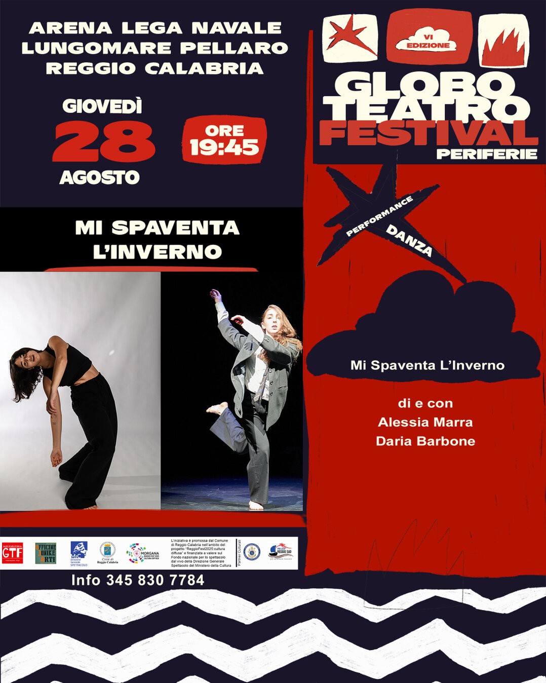 Produzione Officine Jonike ArtiUna performance di danza contemporanea che coinvolge due giovani danzatrici (una calabrese, l’altra pugliese) attive a livello internazionale, in un percorso di sviluppo espressivo e di Performance Art in simbiosi con il sito d’azione. “Mi spaventa l’inverno” ha come punto di partenza il mare, luogo di appartenenza per alcuni, luogo di distacco per altri, luogo da attraversare per altri ancora, isola di approdo ma anche luogo di dolore e perdita. Un viaggio fisico e poetico attraverso le storie del Mediterraneo, dove mito e realtà si confondono. “Mi spaventa l’inverno” nasce dall’ascolto delle memorie che abitano i corpi e le rive: naufragi antichi e contemporanei, voci di dei dimenticati e desideri umani che resistono al tempo. La performance intreccia gesto, silenzio e presenza in una danza che esplora il calore e la violenza del Mediterraneo, e la paura profonda del mare d’inverno - più scuro, più crudele, più vero.
