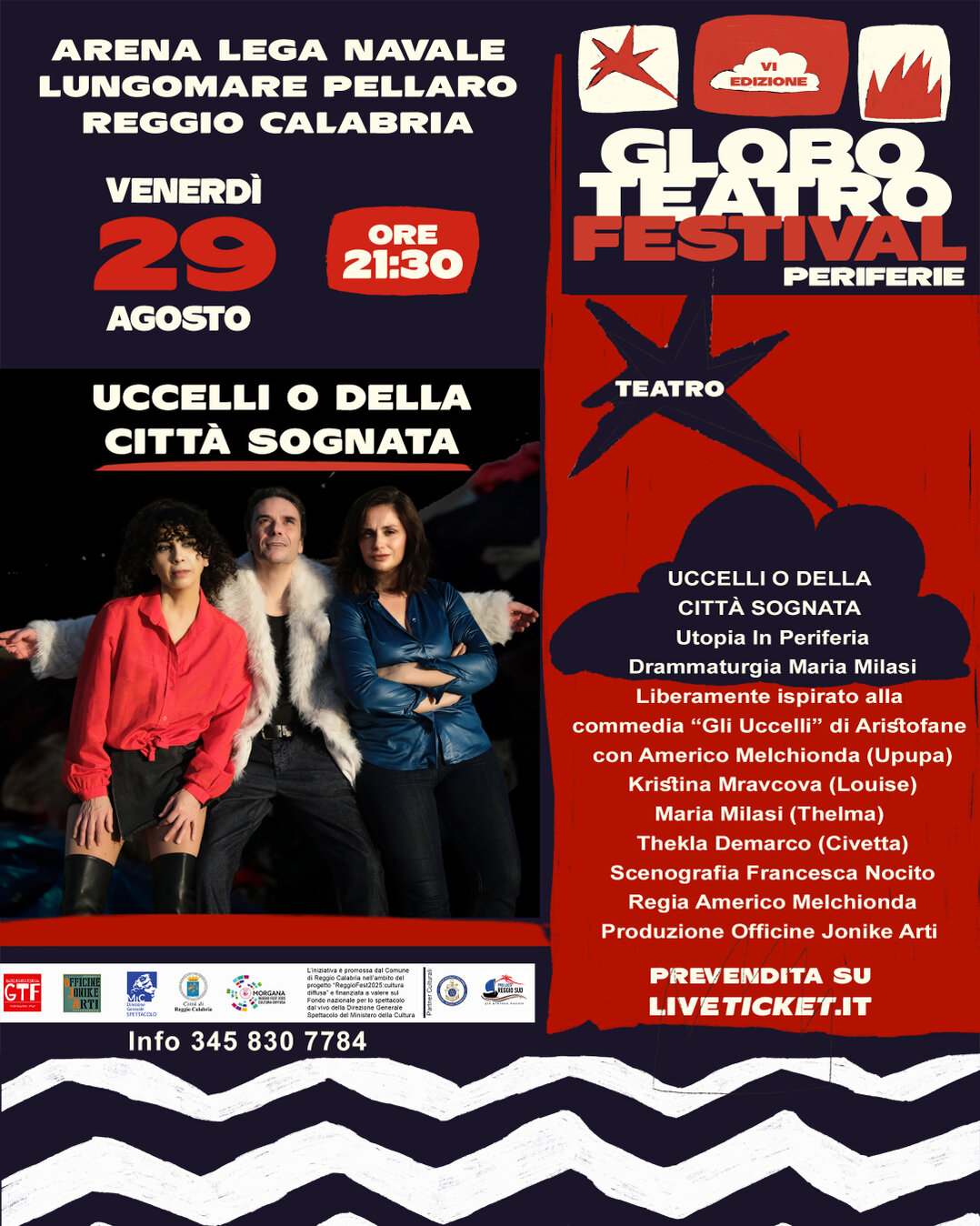 Ispirato alla rivoluzionaria commedia "Gli Uccelli" di Aristofane, dalla metafora quanto mai attuale, lo spettacolo "Uccelli o della Città sognata" diventa altro, reinterpretando in chiave contemporanea personaggi, rocambolesche situazioni e stravolgimenti di ruoli.